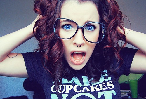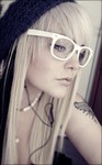Merkmal: ziemlich bunt und freizügig gekleidet | hellblaue Augen | Fakebrille